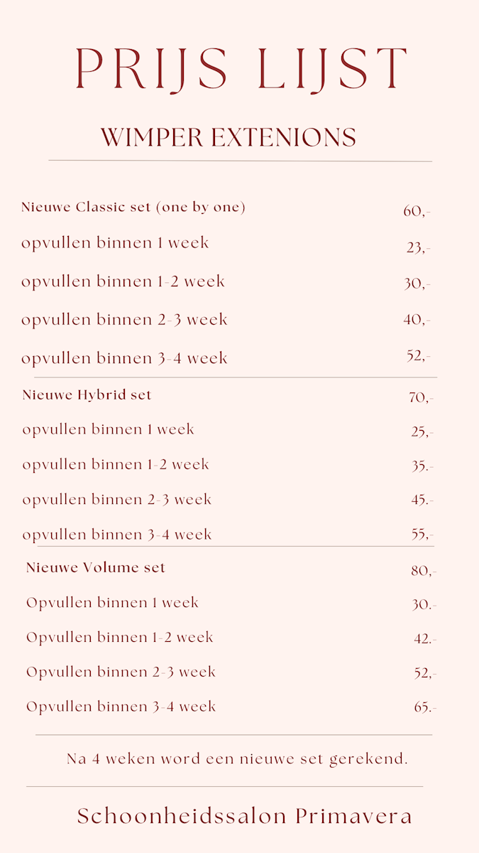 Prijslijst voor de wimper extensions en het opvullen.